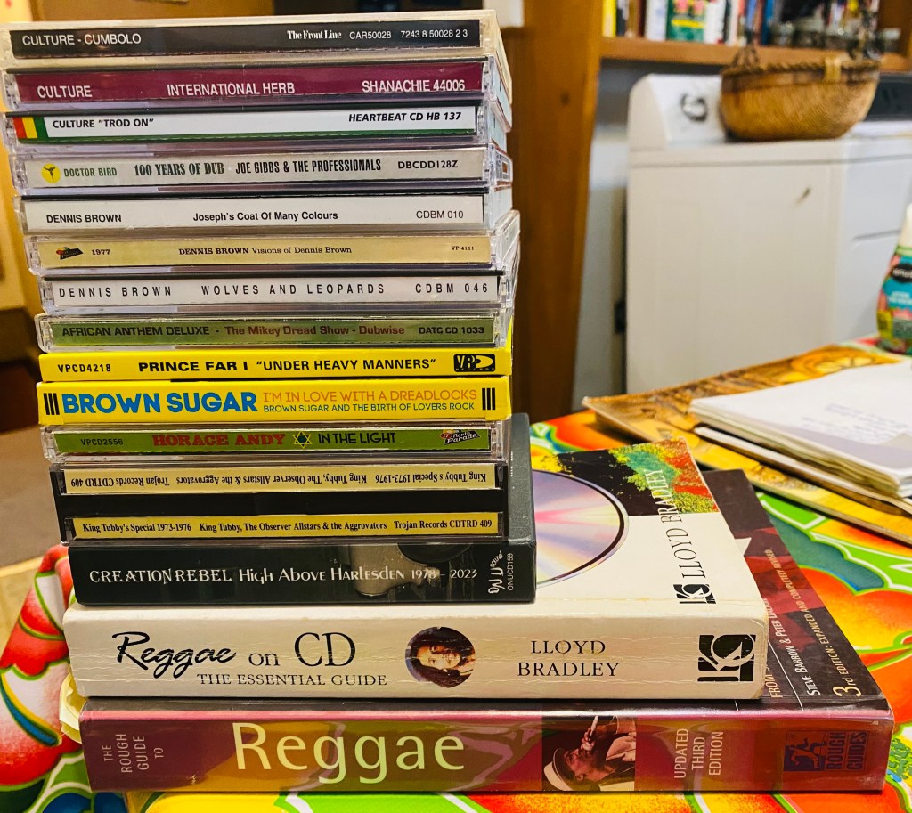 It was all triggered when I rather randomly chose to read Alex Wheatle‘s memoir, Sufferah. Wheatle’s childhood experiences inspired one of the best episodes of Steve McQueen’s limited series Small Axe, all of which I thoroughly loved. Reggae songs were extremely important to Wheatle’s survival as a youth, and he mentioned so many I didn’t know (and I’m pretty well-informed) that I made a playlist as I read (which I accidentally deleted yesterday!). Unsurprisingly, the best of those songs led me to research the albums from which they came via two excellent out-of-print reggae guides, one by Lloyd Bradley, the other by Randall Grass, both acknowledged genre adepts. While researching those, I bumped into non-Wheatle-related records I’d somehow missed. That resulting research led me willy-nilly to Discogs, where–oh hell, I’ll just take a picture. This is the life of a music fanatic folks!