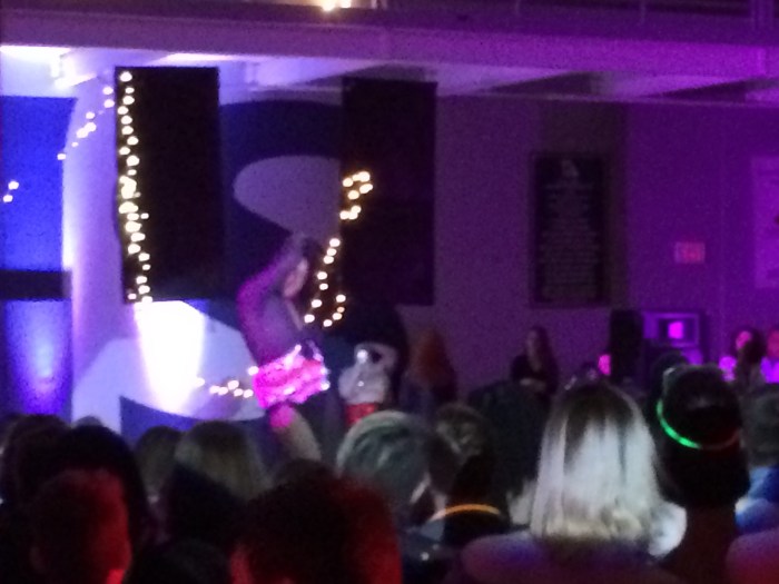 Nicole and I also attended Battle High School’s Pride Prom in the evening. Nicole had volunteered for supervision (she’s the district career center’s liaison to Battle) and I said I’d keep her company–honestly, I was planning on finishing the book! Fortunately, the event was too exciting to miss in favor of reading; it was very well-attended, the kids (and adults) were clearly having a blast, and the centerpiece was a drag show featuring participants from all of Columbia’s public schools. All the queens were energized and fun to watch, but the fifth of five contestants, Black Icing, knocked the crowd dead. Victory was by audience applause, and there was no doubt who reigned supreme.